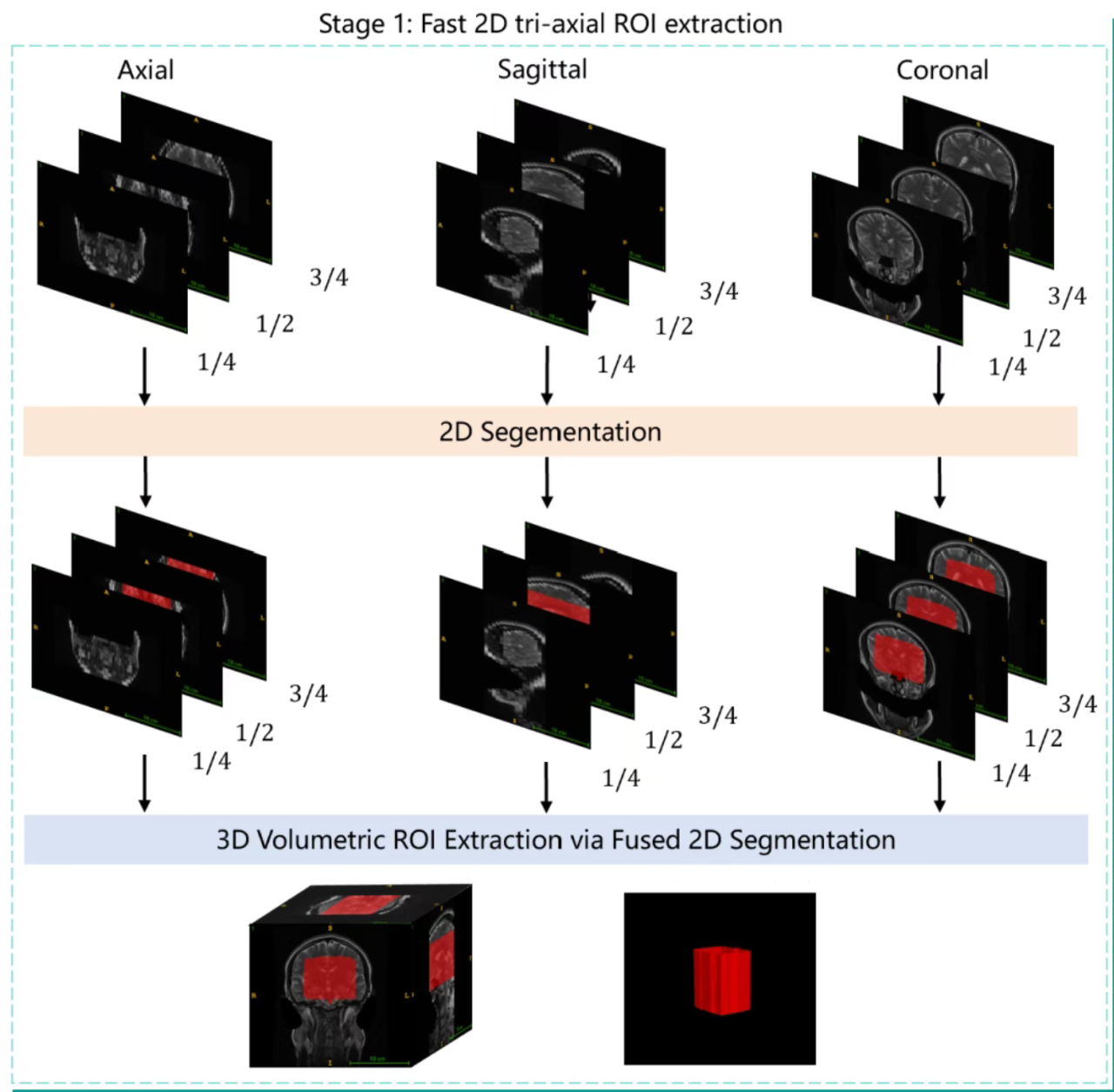 针对原始医学影像数据普遍存在的体积庞大、分辨率高、模态多样以及背景噪声干扰严重等挑战,团队设计了一种基于nnU-Net的极速2D三轴ROI提取分割模型。