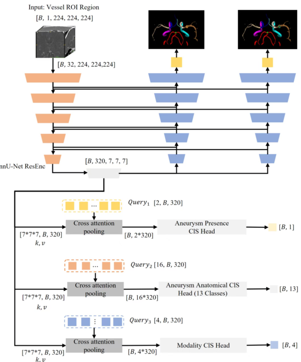 任务设计:团队创新性地将血管和动脉瘤联合分割作为辅助任务,充分利用了血管解剖结构的先验知识(如威利斯环结构),有力地辅助了模型区分动脉瘤与血管解剖结构,显著提高了识别的精确度。