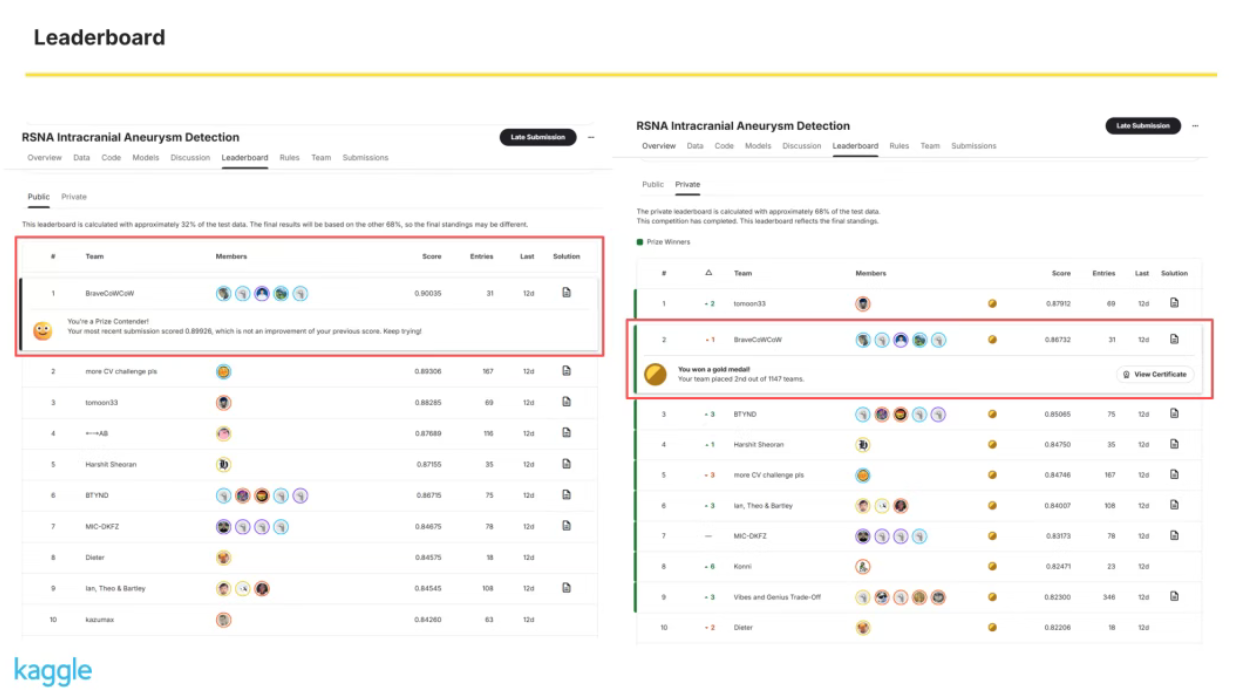 在刚刚落幕的北美放射学会 RSNA 2025 颅内动脉瘤检测 AI 挑战赛中,由一脉阳光孵化的影禾医脉(Medical Image Insights)主导、联合苏黎世大学(UZH)组成的队伍 BraveCoWCoW,从全球 1147 支参赛队伍中强势突围,以公榜第一、私榜第二的卓越战绩荣获全球亚军。
