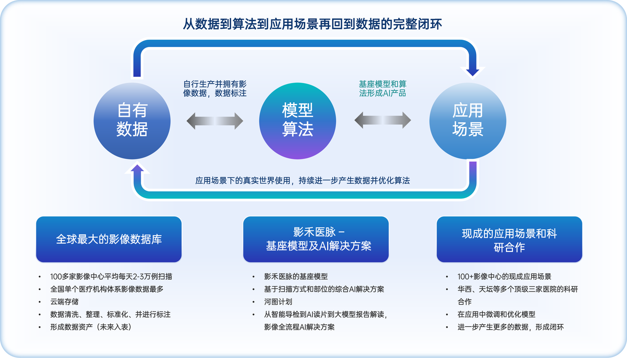 一脉阳光与影禾医脉的深度绑定,早已形成行业独有的发展优势。依托一脉阳光覆盖全国的百余家影像中心网络,双方沉淀了超4000万例高质量标准化影像数据资产,形成业内最大规模的真实世界影像数据库,为AI研发奠定了坚实基础。在此之上,影禾医脉成功自主训练出全球首个跨模态全流程的“影禾觅芽®”医学影像基座大模型,实现从X线、CT、MR到PET等多模态影像的统一理解与智能分析,该基座模型不仅支撑了“胸部CT平扫辅助诊断AIR”“冠状动脉CTA智能分析”等路径级AI产品落地,更通过“MIIA-iSpacs智慧影像系统”“MIIA-iData数据资产化平台”“MIIA-iResearch科研赋能平台”及“MIIA-AI工具部署平台”四大产品矩阵,为医院、影像中心及科研机构提供可复制、可迭代的AI赋能解决方案。模型能力反哺赋能影像中心后,核心优势在于实现了“数据驱动模型进化、模型赋能业务提升、业务再生优质数据”的自我强化闭环,这不仅提升了诊断效率与一致性,也为AI产品的持续优化提供了源源不断的燃料。