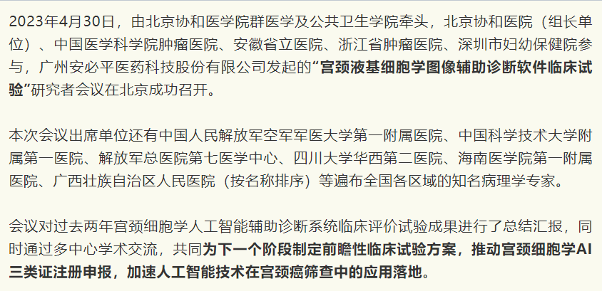 北京协和医院妇产科主任朱兰教授指出:人工智能+宫颈癌筛查模式已成为了发展趋势,并预祝安必平宫颈液基细胞学图像辅助诊断软件(LBP-PIAS)临床试验项目将获取成功,早日投入市场应用,助力加速消除宫颈癌。