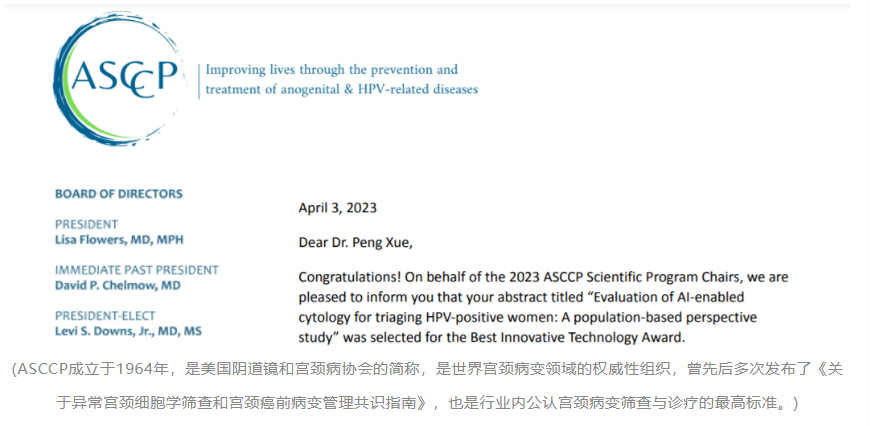 历经两年的项目成果,让安必平LBP-PIAS斩获2023年美国阴道镜及宫颈病理学会(American Society for Colposcopy and Cervical Pathology,简称ASCCP)科技创新奖,多中心专家共同参与编撰的论文在《现代病理学杂志》发表,体现了国际权威组织对中国人工智能技术在宫颈癌筛查中的高度认可,同时意味着人工智能助力“加速消除宫颈癌全球战略”又往前迈进了一大步。